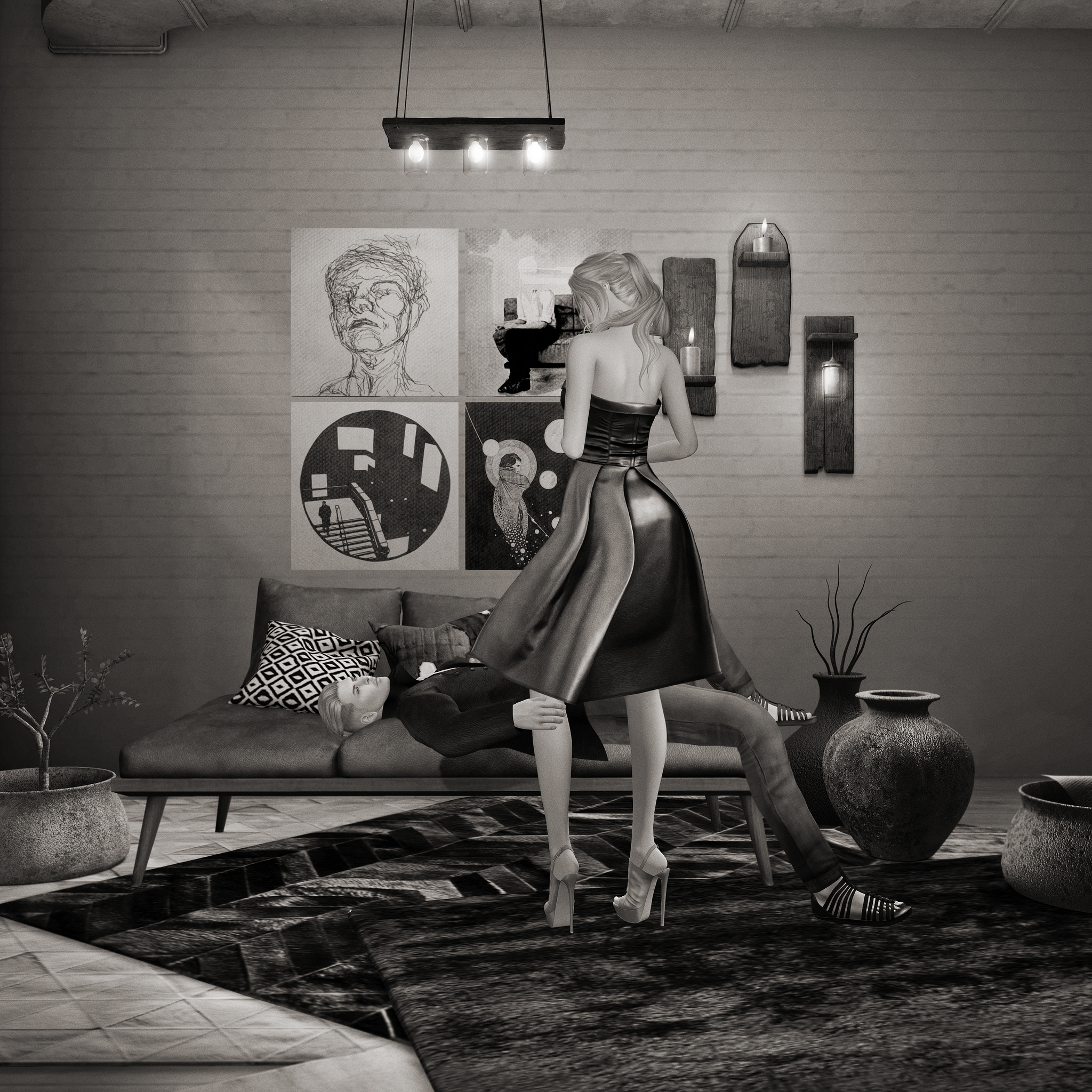 Wearing Olive The Late Hair, Essenz Amsterdam Heels and Valentina E. Cara Leather Dress. Joseph is wearing Bauhaus Movement David Jacket, xin. emmanuel chinos, Deadwool Undercut Hair & Clef de Peau James skin.